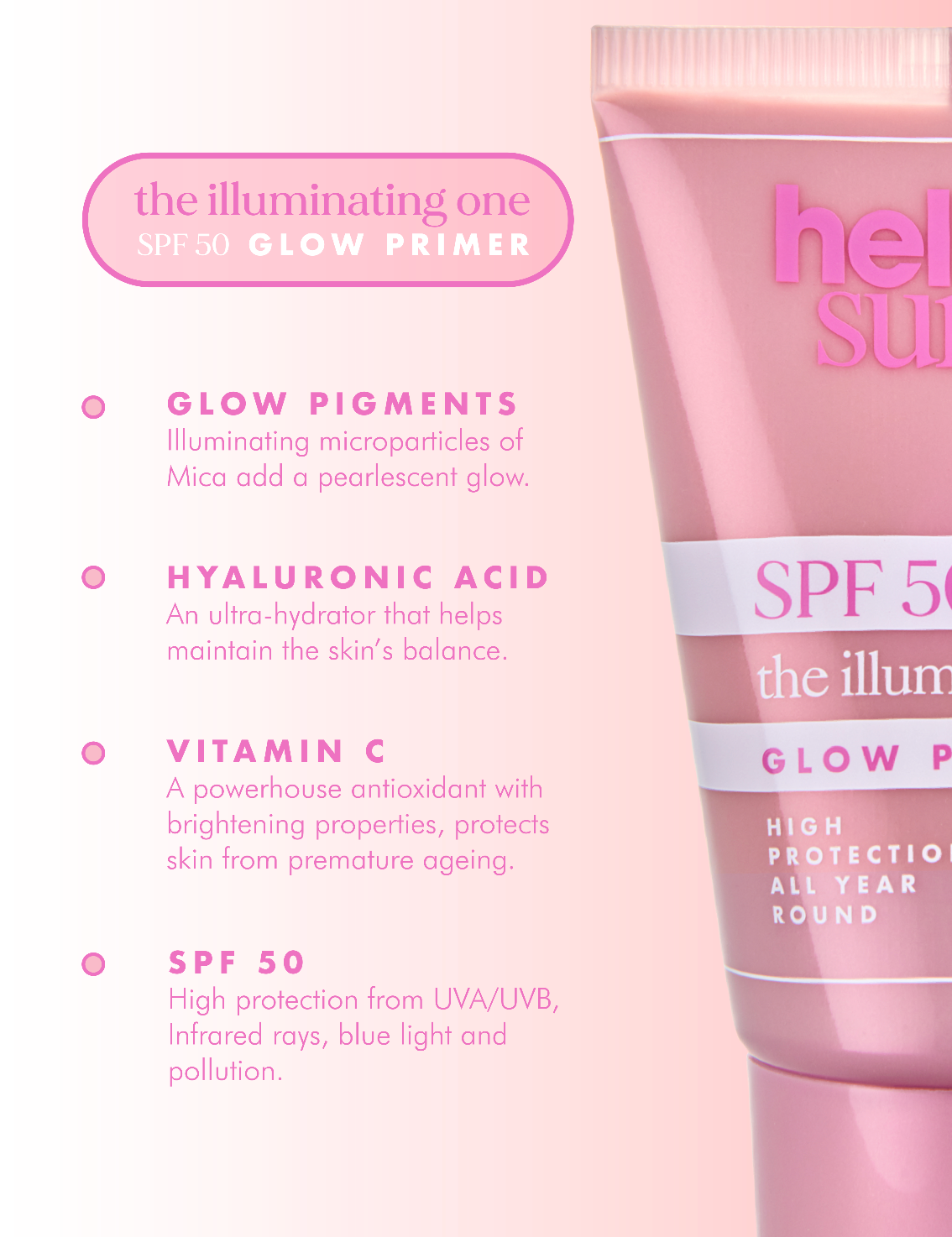 The Illuminating One offers the high-factor, broad-spectrum SPF protection AND the protection from life's everyday aggressors that you have come to know and love from Hello Sunday. But the benefits don't stop there... This illuminating primer contains micro particles of Mica to add a pearlescent glow to your skin, plus active skincare ingredients Vitamin C and Hyaluronic Acid which also treat the skin to prevent moisture loss and boost your natural radiant glow.